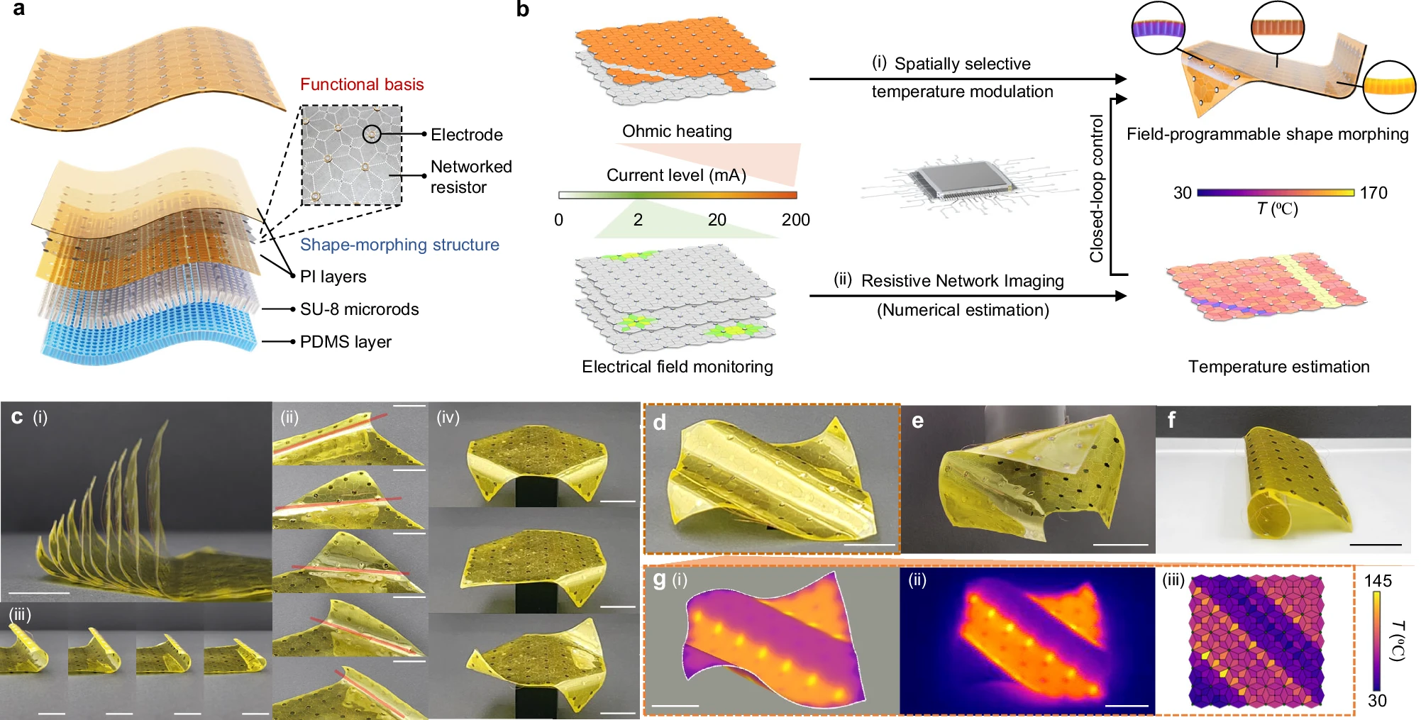 An interconnected set of metallic resistors, incorporated into the thermo-responsive polymer film, performs the dual functionalities of a heater and thermoreceptor, selectively recruited to configure folds through electronic modulation of its electrical power distribution.