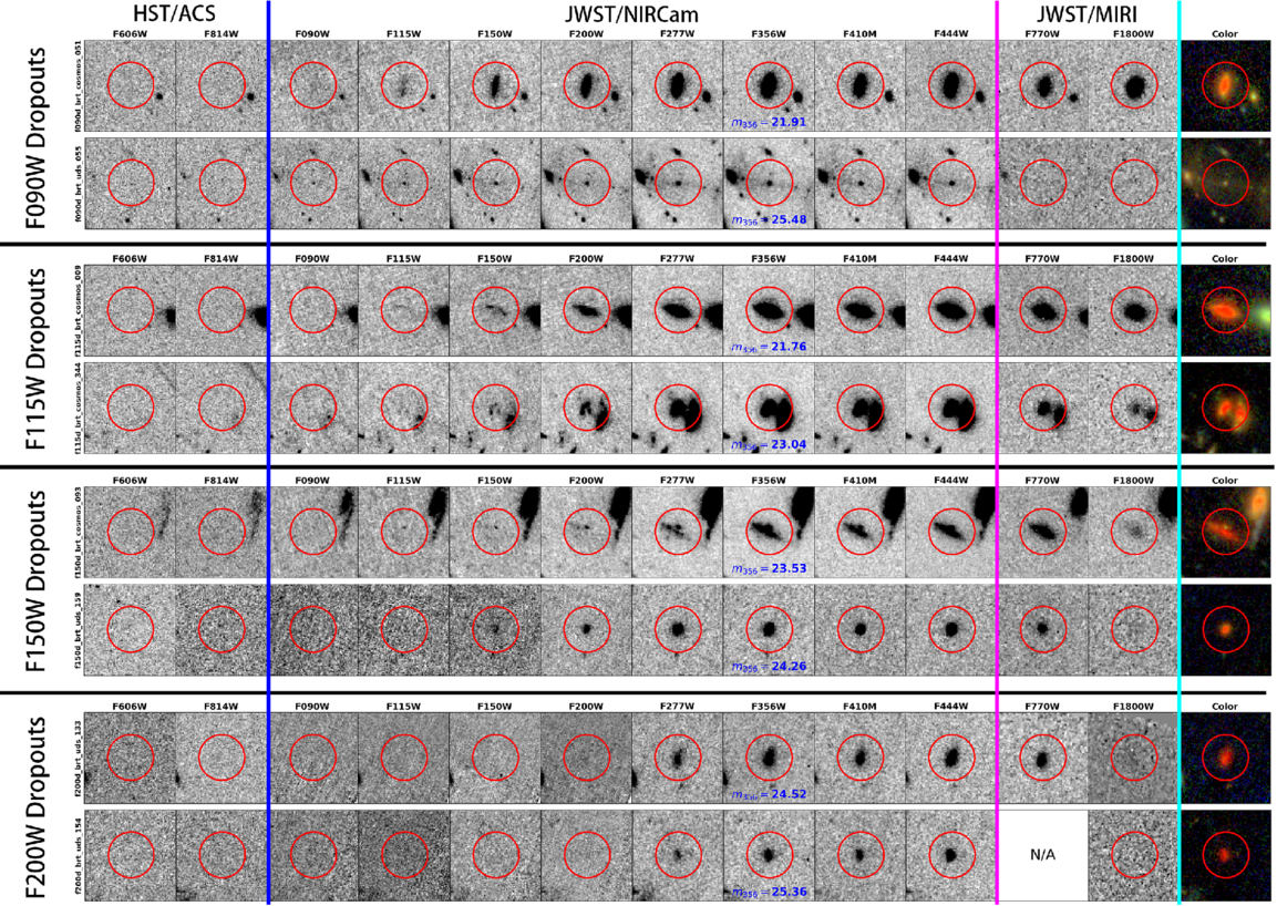 Figure 1. Image stamps of example very bright dropouts in F090W, F115W, F150W, and F200W, arranged from top to bottom. Two example objects are shown for each group.