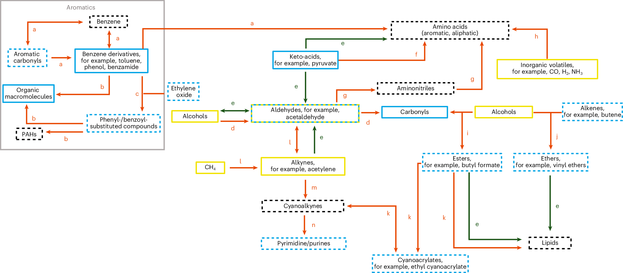 Fig. 6: Potential chemical pathways between organic compounds on Enceladus.
